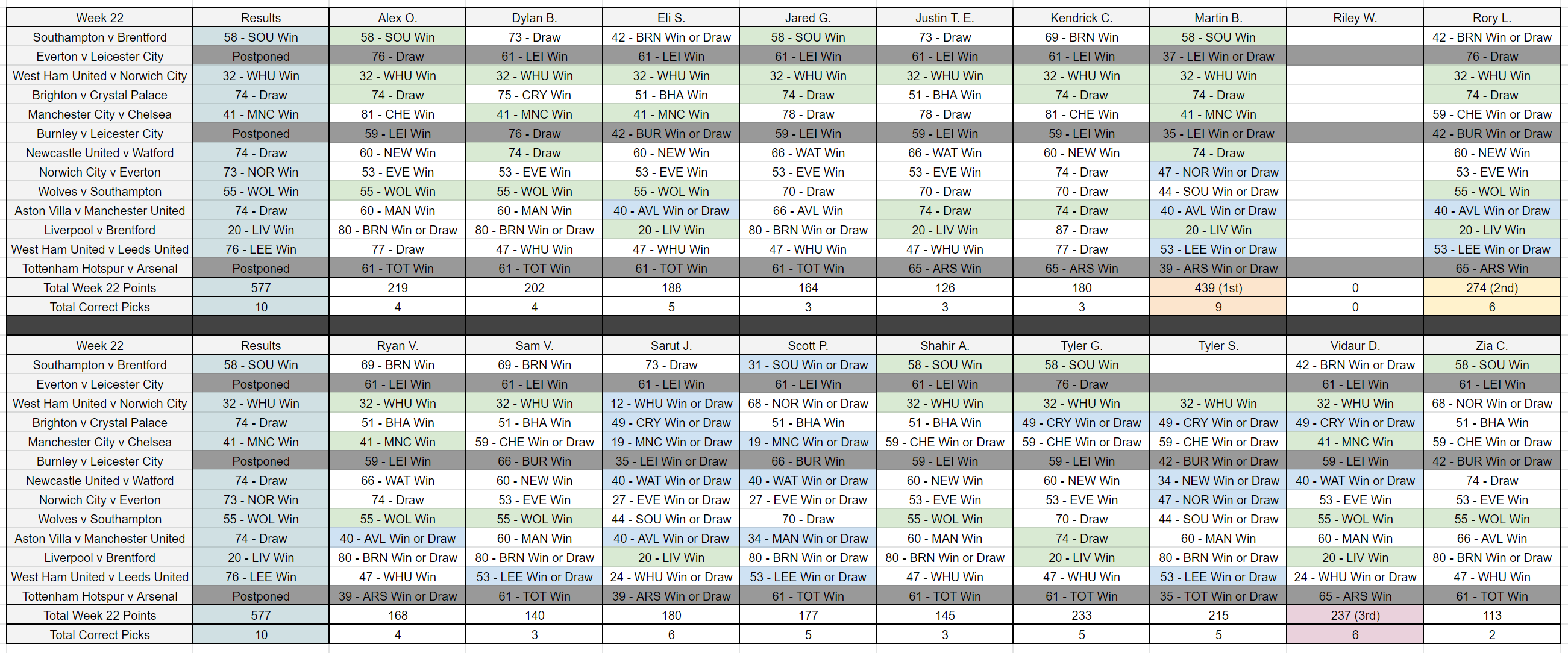 Week 22 Results January 17, 2022 T. Stewart week 22 resultsDownload Share this: Click to share on X (Opens in new window) X Click to share on Facebook (Opens in new window) Facebook Like Loading... Related