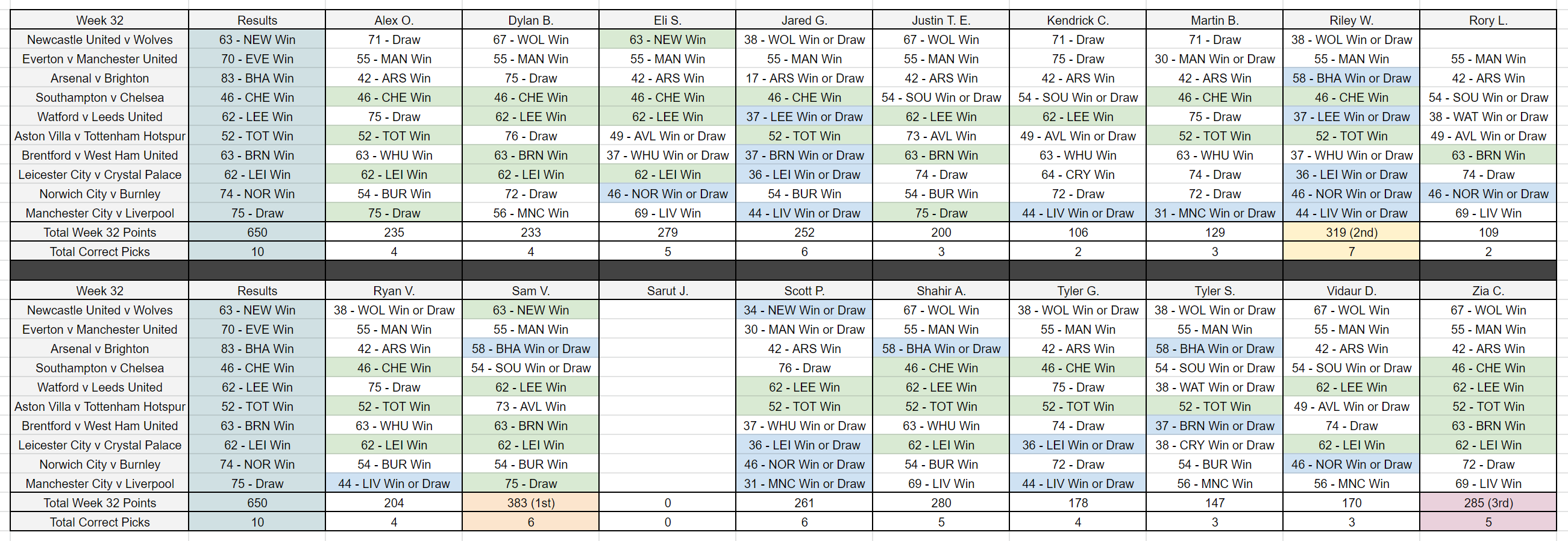 Week 32 Results April 14, 2022 T. Stewart week 32 resultsDownload Share this: Click to share on X (Opens in new window) X Click to share on Facebook (Opens in new window) Facebook Like Loading... Related