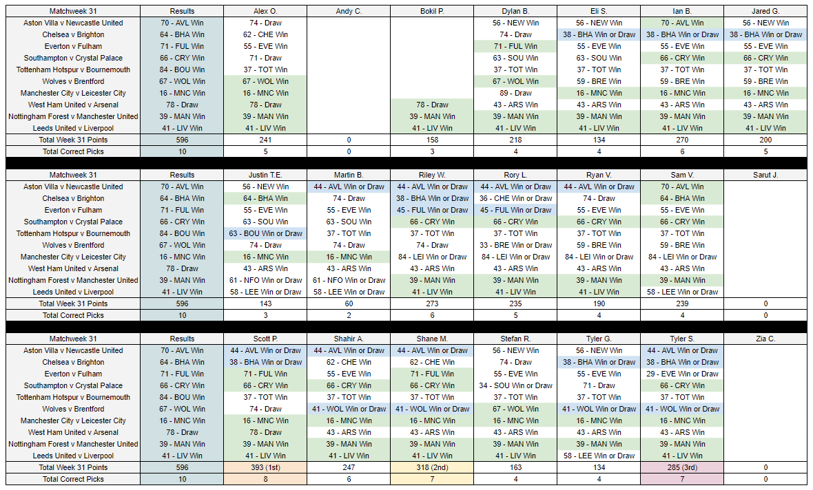 Week 31 Results April 18, 2023 T. Stewart week 31 resultsDownload Share this: Click to share on X (Opens in new window) X Click to share on Facebook (Opens in new window) Facebook Like Loading... Related